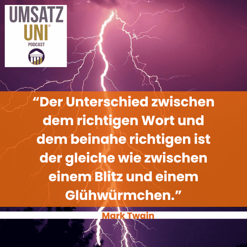Mark Twain hat einmal gesagt: Der Unterschied zwischen dem richtigen Wort und dem beinahe richtigen ist der gleiche wie zwischen einem Blitz und einem Glühwürmchen. Dieses Zitat ist ein phantastischer Merksatz für jeden der erfolgreich verkaufen möchte: Der Unterschied zwischen dem richtigen Verkaufsargument und dem beinahe richtigen ist der gleiche wie zwischen einem Blitz und einem Glühwürmchen. Stellt sich nur die Frage: Was sind die richtigen Verkaufsargumente?